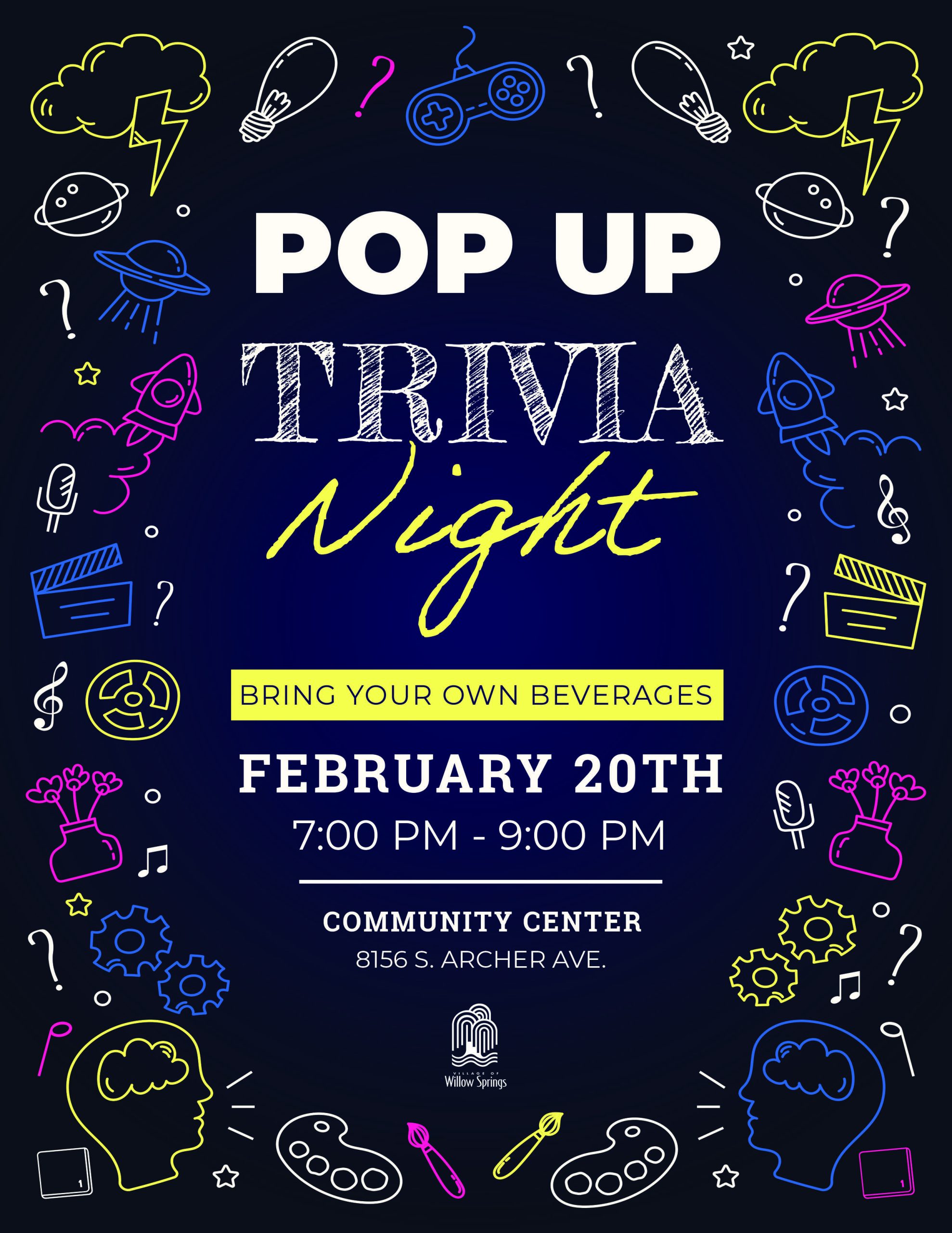 POP UP Trivia Night + Add to Google Calendar + iCal / Outlook export 00 days 00 hours 00 minutes 00 seconds Date Feb 20 2026 Time 7:00 pm - 9:00 pm Location Community Center 8156 Archer Ave Share this event